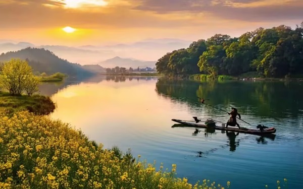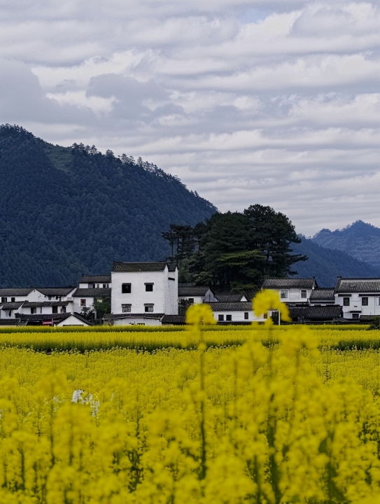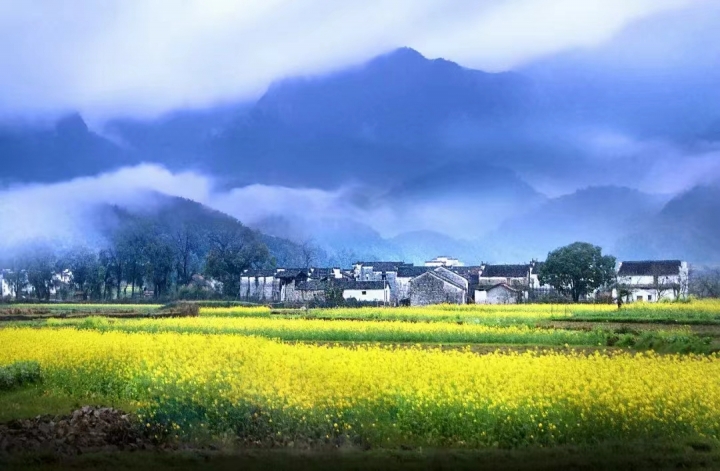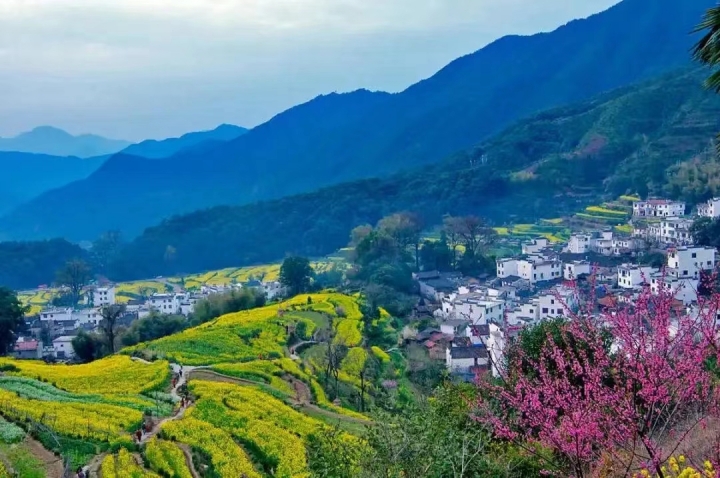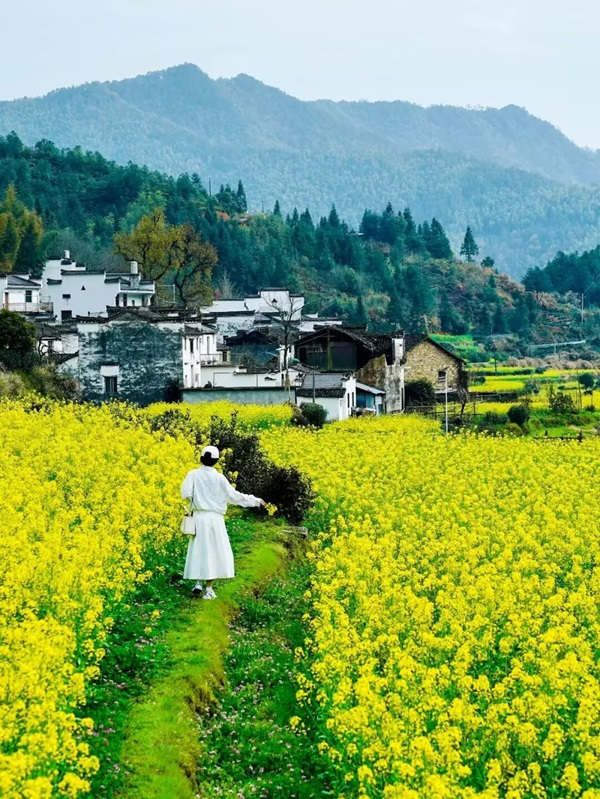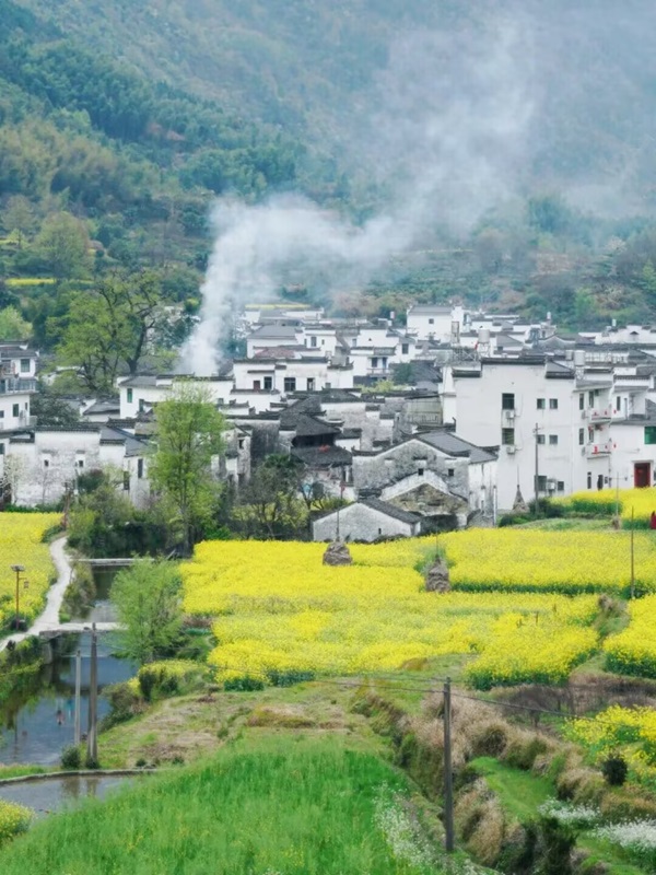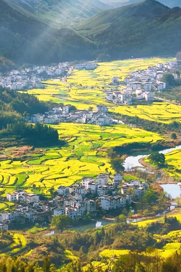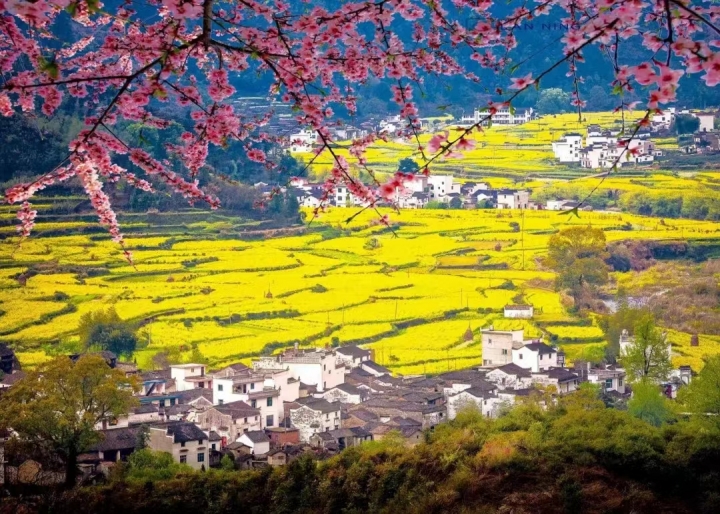 ”春天的婺源,粉墙黛瓦与金黄油菜花交相辉映,