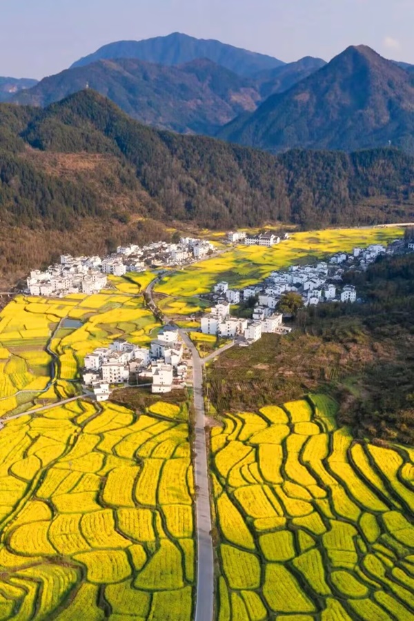 江岭油菜花梯田或许是婺源最值得去的地方,因为那里漫山遍野的油菜花呈梯田状,从山顶铺散到山谷下。站在山顶望去,脚下大片的山谷中,油菜花层层叠叠,一望无际,中间围扰着几个小小的村落,黑瓦白墙的徽派民居夹杂在一片金黄之间,唯美意境。一路沿古道徒步而上,到达山中江岭村或者最高观景台为止,再由另一条古道而下,从各种角度欣赏江岭油菜花梯田之美! 爬上江岭的高处,千亩油菜花田一览无余,金黄色的油菜花肆意蓬勃地开放,粉墙黛瓦的徽州民居鳞次栉比,古老村落点缀在广阔的油菜花丛中,成为江岭风光的大背景。山风里更飘荡着淡淡的油菜香,不愧为“中国最美乡村”中田园风光的代表作。