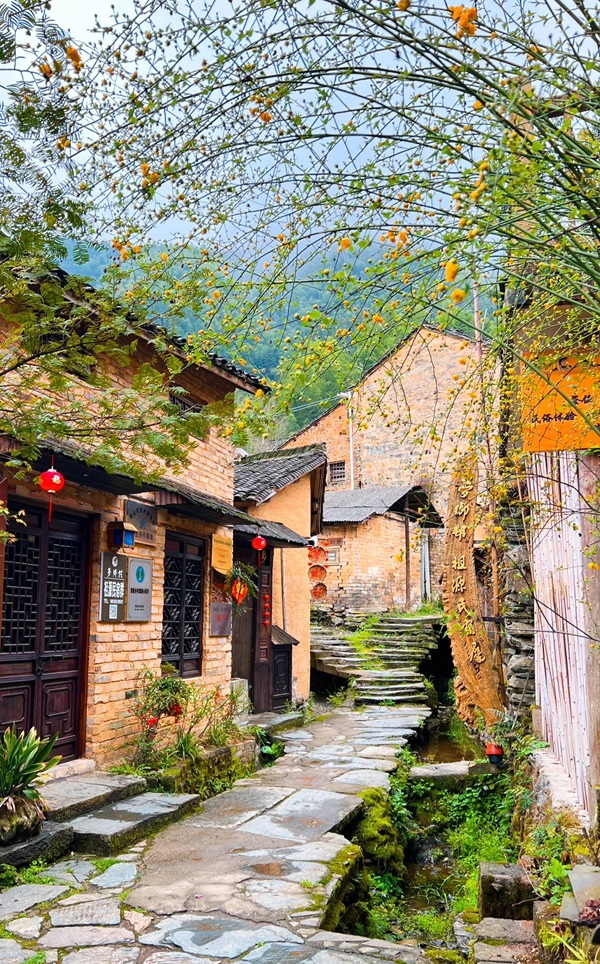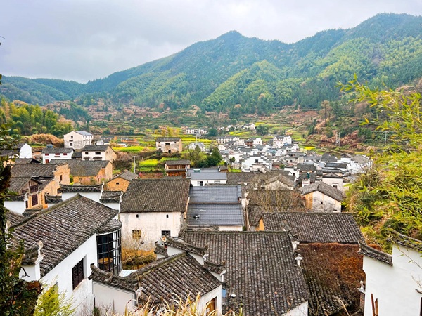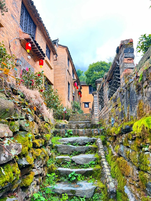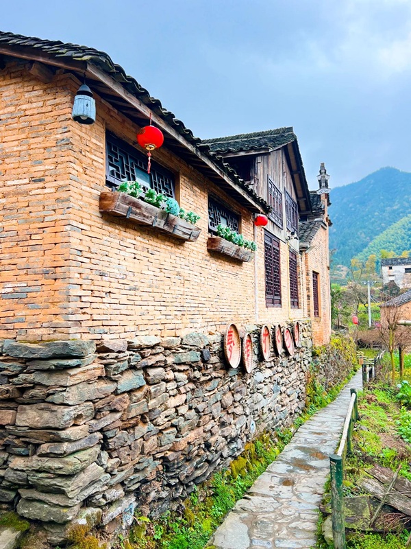 青砖黛瓦马头墙,回廊挂落花格窗,村民的房屋依山而建,保留了徽派建筑的原汁原味,由南至北,呈阶梯状扩展。碎石垒成的墙基犬牙交错,斑驳的粉墙随花落篱,脚下石板路破碎坎坷,一景一物都描绘着岁月的沧桑。